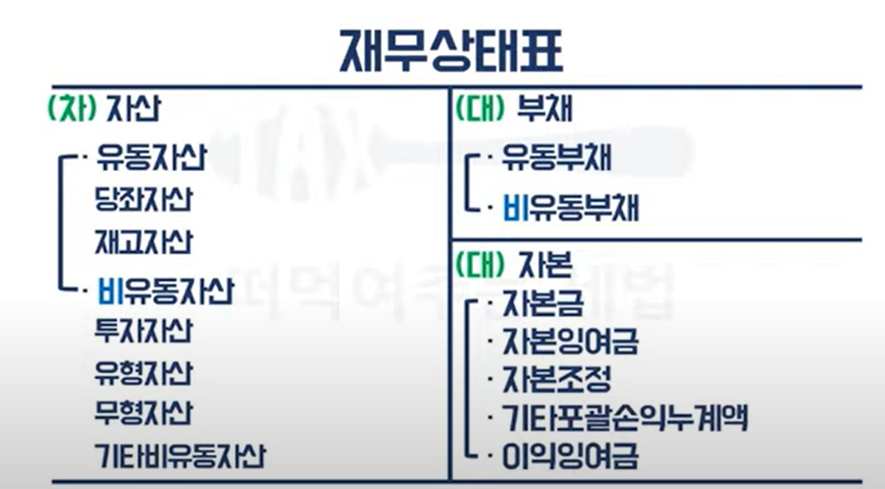 - 재무상태표 (Statement of Financial Position): 기업의 특정 시점(결산일)에 자산, 부채, 자본의 상태를 보여주는 표입니다.