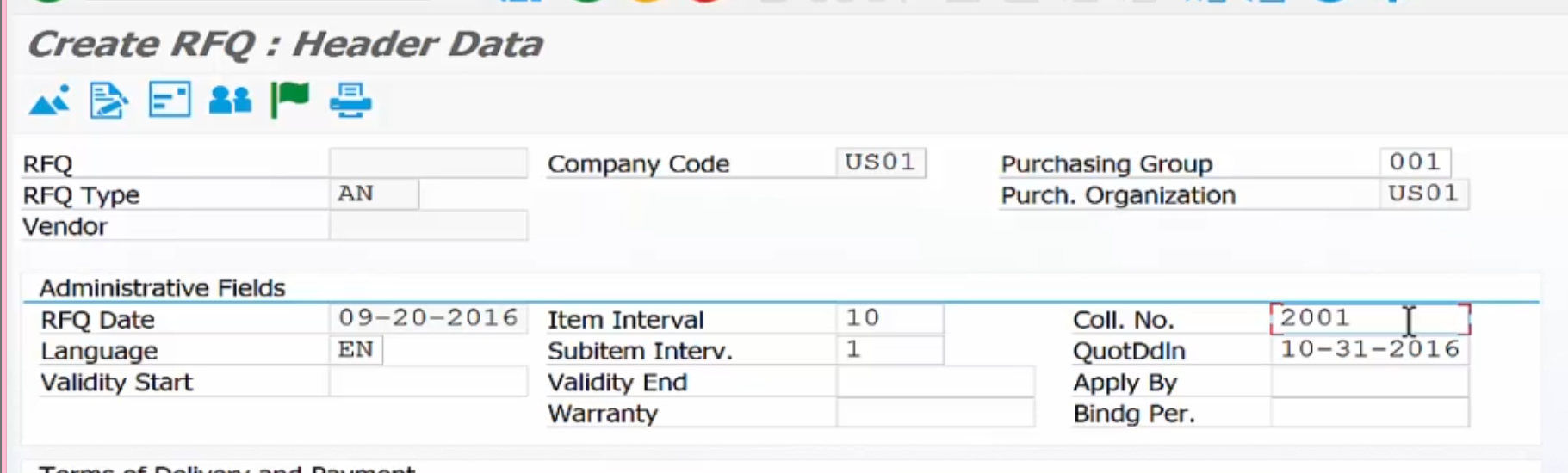 - 앞서 생성된 RFQ 문서 번호를 모두 기억하기는 어렵습니다. 이럴 때 **집계 번호(Collective Number)**를 활용합니다. Search by Collective Number 옵션을 선택한 후 2001을 입력하면 관련 RFQ 문서들이 모두 나타납니다.