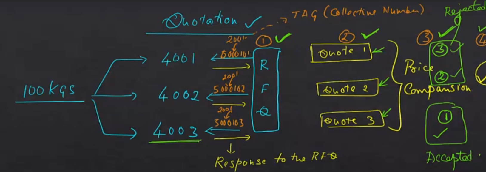 - 견적서(Quotation) 접수 RFQ를 받은 각 공급업체는 요구사항에 대한 **응답(Response)**으로 자신들의 가격, 납기 가능 여부 등을 담은 견적서를 제출합니다. SAP 시스템에서는 이 응답이 각각 별도의 견적 문서(Quote 1, Quote 2, Quote 3)로 기록됩니다.