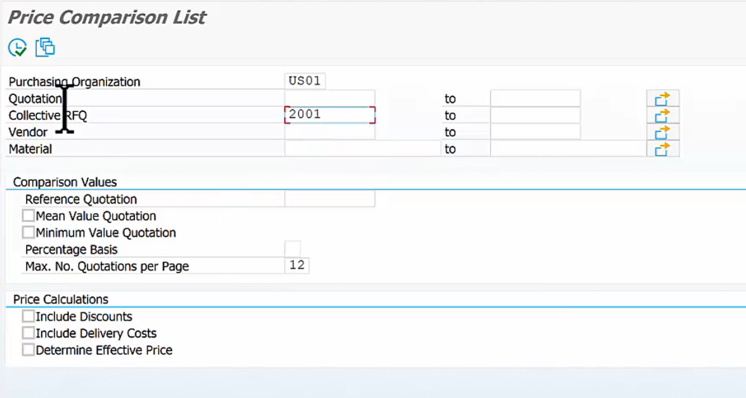 - 메뉴 경로: Logistics > Material Management > Purchasing > RFQ/Quotation > Quotation > Price Comparison
