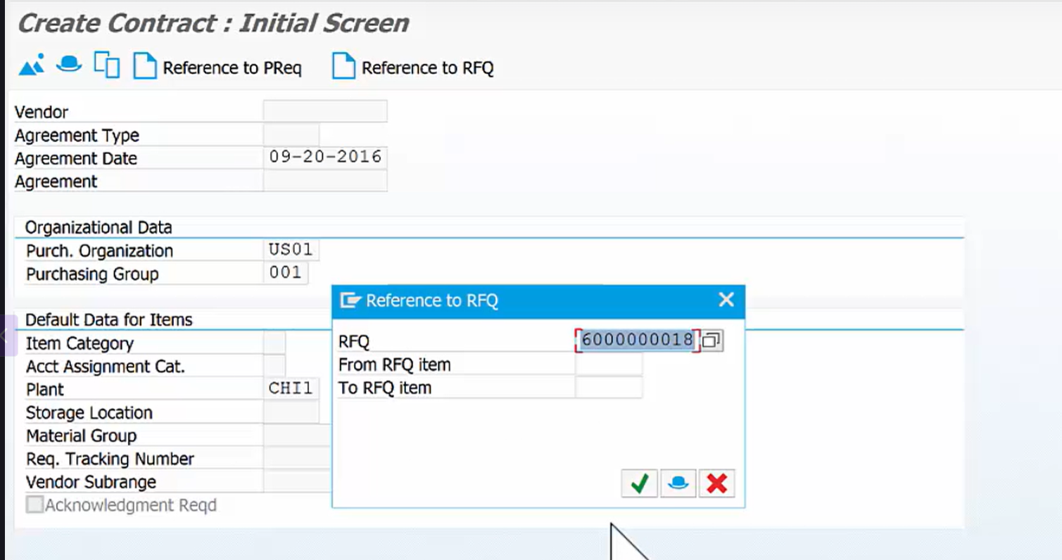 - 메뉴 경로: Logistics > Material Management > Purchasing > RFQ/Quotation > Request for Quotation > Create