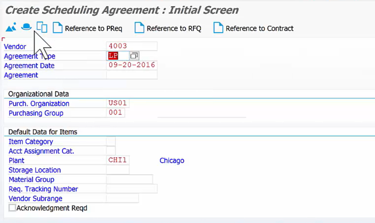 - T-code ME31L (스케줄링 계약 생성)로 이동합니다.