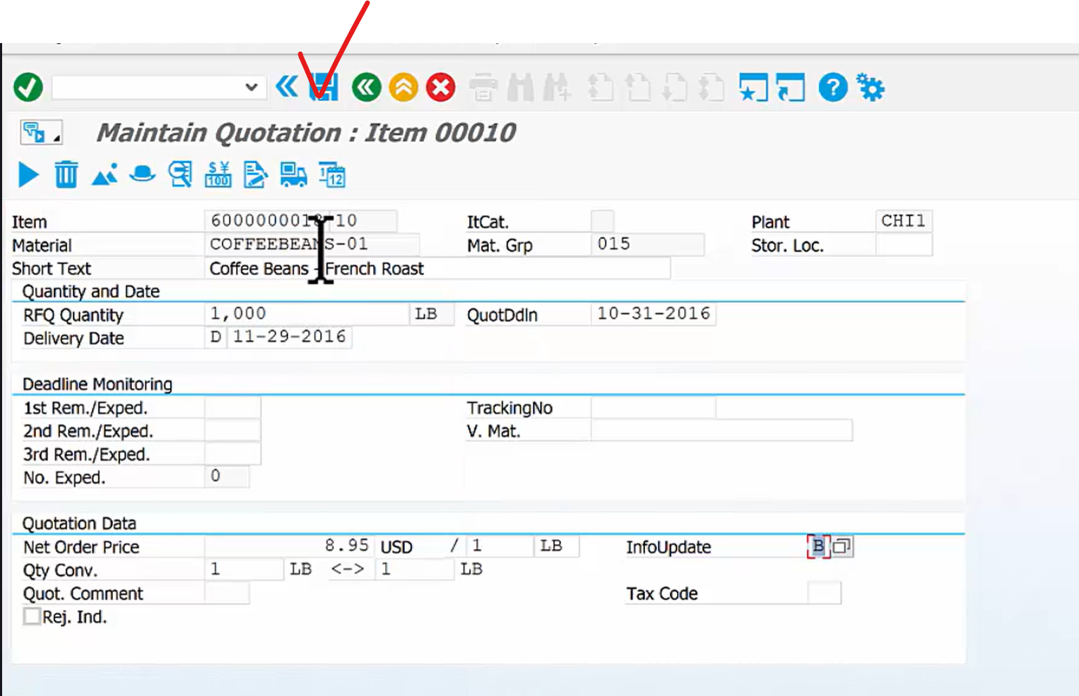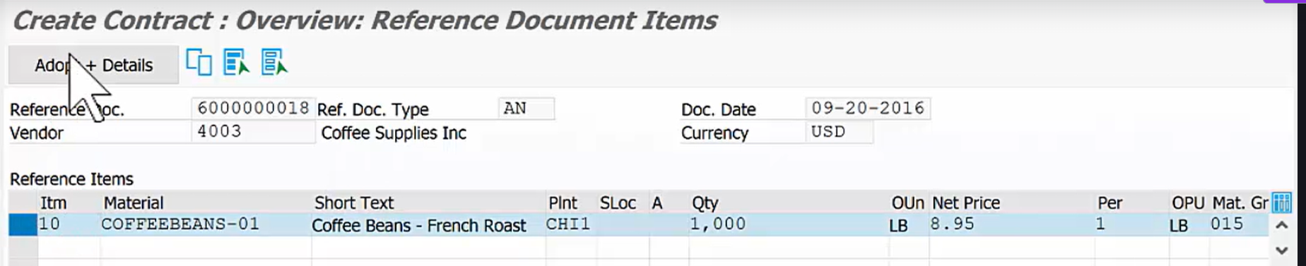 - 저장하면 시스템이 공급업체 4003과 **자재 '커피 원두'**에 대한 구매 정보 레코드(8.95의 가격)를 자동으로 생성합니다.