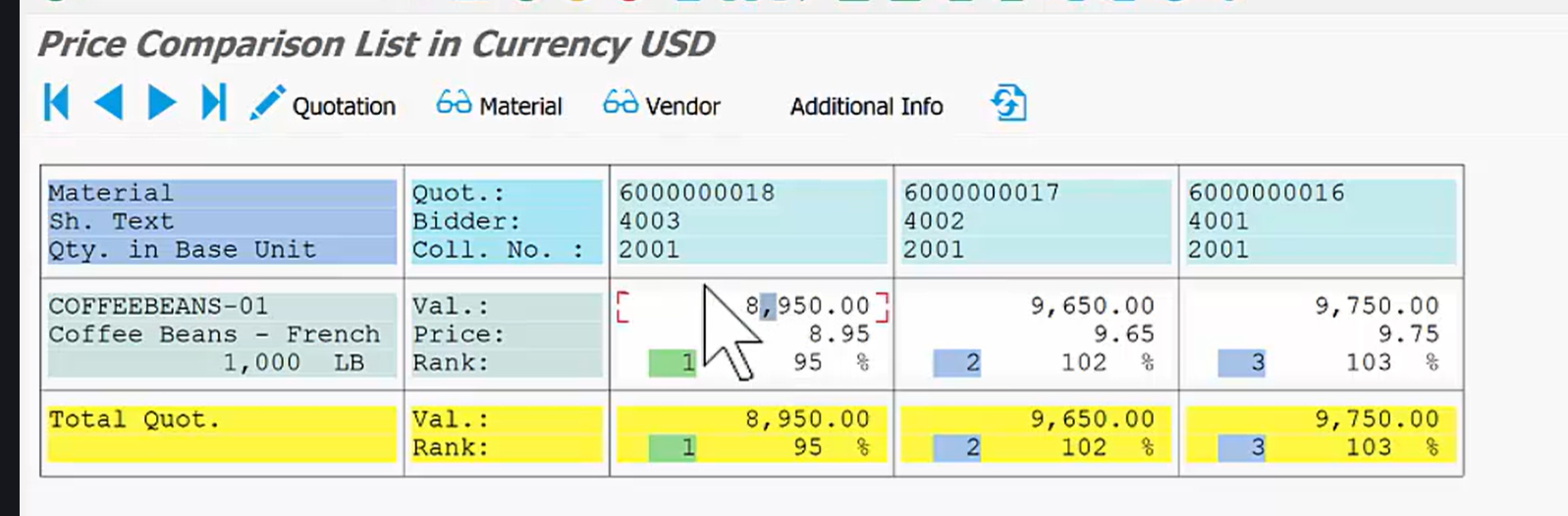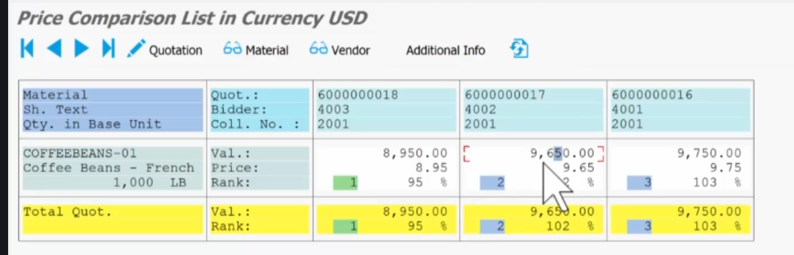 - 다시 **집계 번호(2001)**를 사용하여 비교를 실행합니다. SAP 시스템은 각 공급업체의 견적 가격을 한눈에 비교할 수 있도록 정렬하고 순위를 매깁니다.