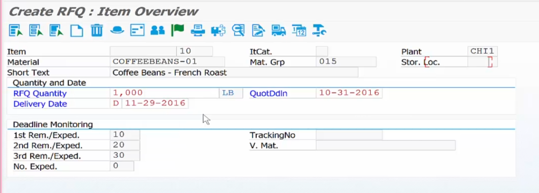 - 필요한 자재(예: Coffee Beans)와 수량(예: 1,000 파운드), 그리고 납기일(Delivery Date)을 입력합니다. 이 정보는 모든 공급업체에게 동일하게 적용됩니다.