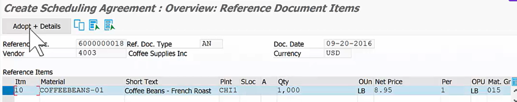 - T-code ME21N (구매 주문 생성)에서 공급업체 4003과 자재 '커피 원두'를 입력합니다.