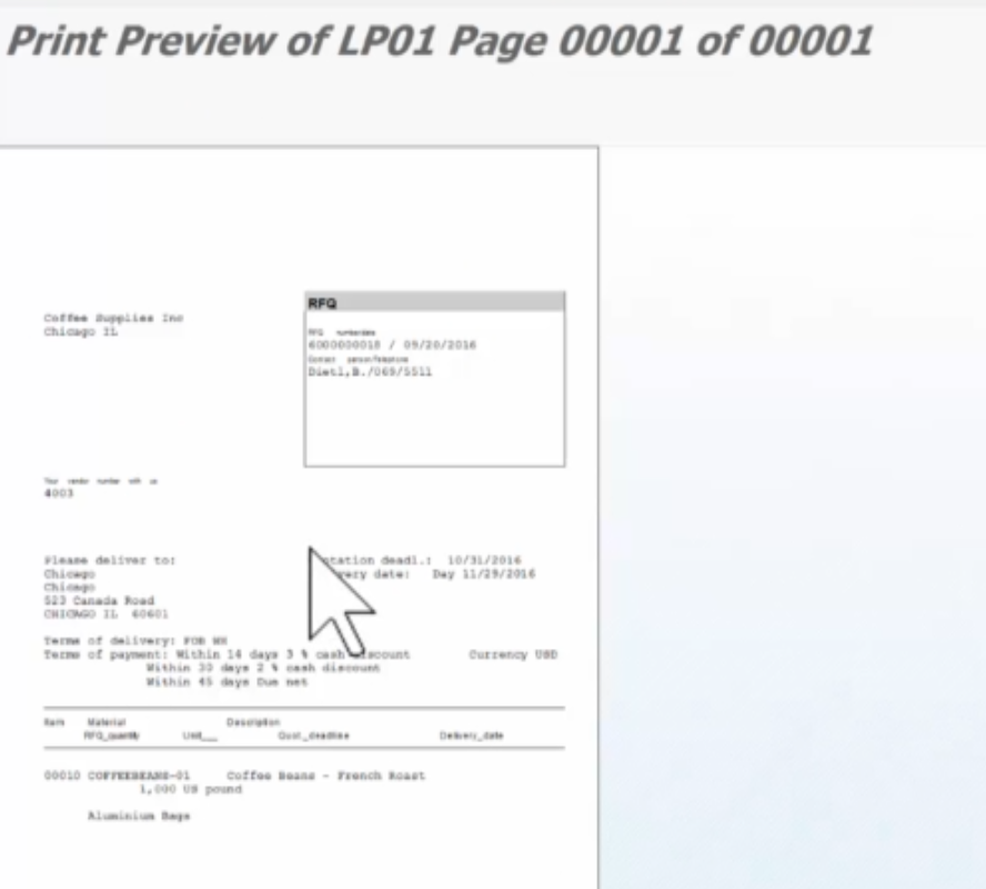 - 견적 요청(RFQ: Request For Quotation) 구매하고자 하는 품목(예: 커피 원두 100kg)에 대해 공급업체들에게 공식적인 견적을 요청하는 단계입니다. RFQ 문서에는 필요한 품목의 상세 정보(수량, 납기일 등)가 명시됩니다. 예를 들어, 공급업체 4001, 4002, 4003에 동일한 RFQ를 발송하여 각 공급업체의 견적을 받아내는 것이 이 단계의 핵심입니다.
