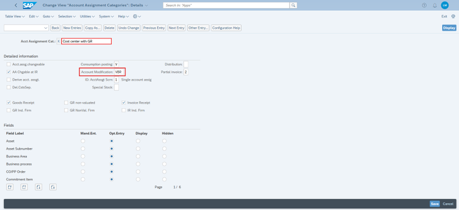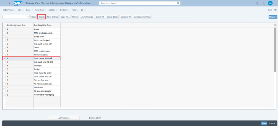 Path: SPRO > IMG > Material management > Purchasing > account assignment –maintain account assignment categories